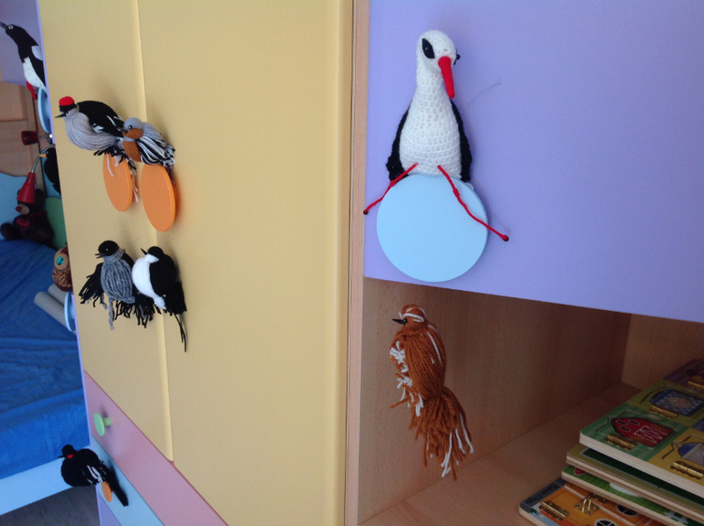 Обещала показать наших рукотворных птиц, а заодно объявить розыгрыш) дело в том, что это самые распространённые персонажи сказок и потешек, а купить их трудно. Пока развешивали по шкафчику, успели выучить практически всех) Мастер - класс по ним элементарный, выкладывал здесь кто-то из девочек, если надо найду ссылку.Итак, объявляю небольшой конкурс! Кто первым правильно опознает всех птиц - от меня приз. Ну очень достойная книжечка) дело в том, что среди старших детей возникли прения, по поводу принадлежности той или иной птицы к своему семейству. Поэтому очень интересно, насколько идентичными они получились) набралось 14 птиц.