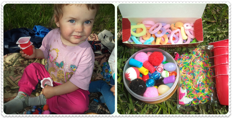 Резиночки она любит одевать на пальчики, в стаканчики перекладывать шарики, помпоны, еще там виднеются колпачки от фломастеров, которые мы любим вставлять друг в друга.