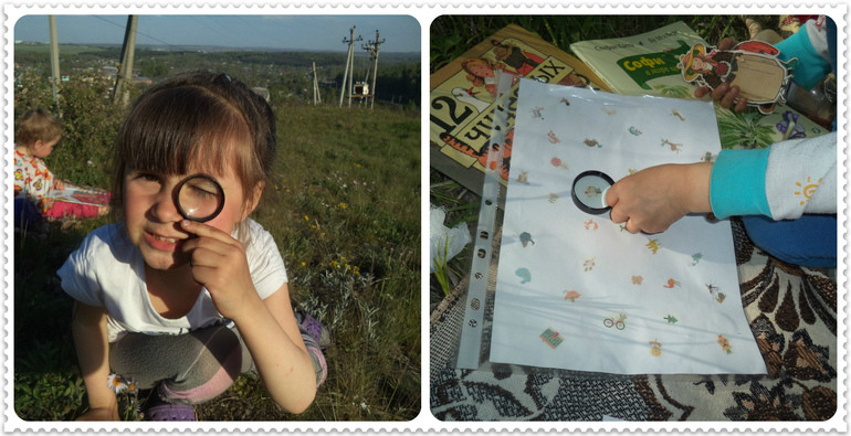 Мы не только рвали цветы, но и вдыхали ароматы, наблюдали за насекомыми, рассматривали через лупу. Аришу не очень впечатлил последний предмет, а вот младшая не выпускала из рук - крутила, вертела, нам подрожала.
