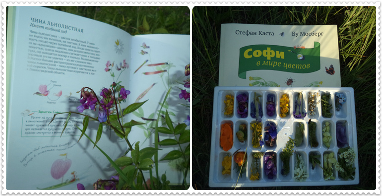 Перед прогулкой со старшей дочкой посмотрели замечательную книгу Софи в мире цветов, Ариша захотела взять ее с собой и отыскать цветочки такие же, но время цветения некоторых цветов еще не настало, поэтому у нас была всего одна находка - чина льнолистная, мы в детстве называли ее "мышиный горошек".