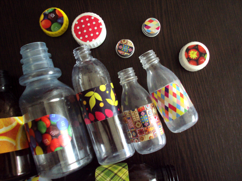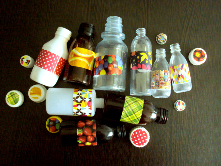 Вот, например, такие бутылочки из-под сиропов. Распечатала на самоклейке узоры-текстуры, наклеила и задача проста - подобрать соответствующую крышечку и закрутить.
