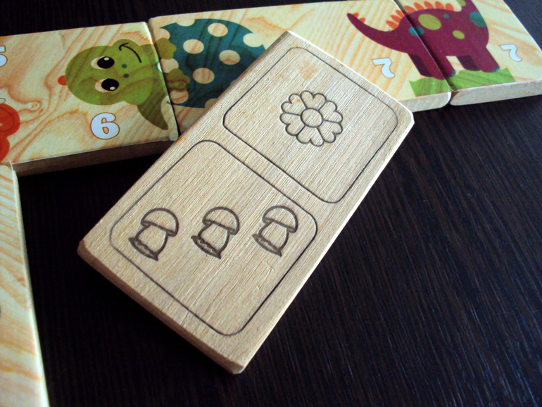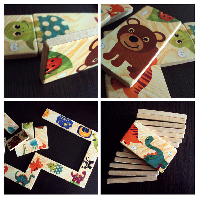 На самоклейке распечатала, готовила картинки в фотошопе. Вообще тут больше задача сложить половинки картинок в дорожку, чем играть по правилам классического домино. Ребенку понравилось. Помимо этого, как обычно, применяем не по назначению - строим башни, дорожки, заборчики и т.п.)