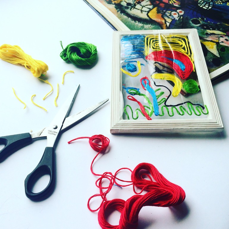 4. Теперь переворачиваем рамку и начинаем творить! Возьмите один моток мулине, и не отрезая начинайте приклеивать на основу по нарисованному контуру. Одной рукой прижимайте нитку к основе, а другой помогайте вести нитку по нужному контуру. Это немного напоминает лепку. Аккуратно приглаживайте все нитки. Лучше сложить нитку в 2-3 раза или взять шерстяные, если сложно приклеивать. После того как будут решены все контуры, начинаем заполнять фигуры нитками от контура к центру. Можно делать это формируя волнообразные штрихи. Не страшно если останутся пробелы. Совсем маленькие детки могут просто клеть линии, прямые, округлые на основу, получиться живая и интересная абстрактная композиция! В работе используете как минимум 3-4 цвета, чтобы получилось яркое и контактное сочетание!