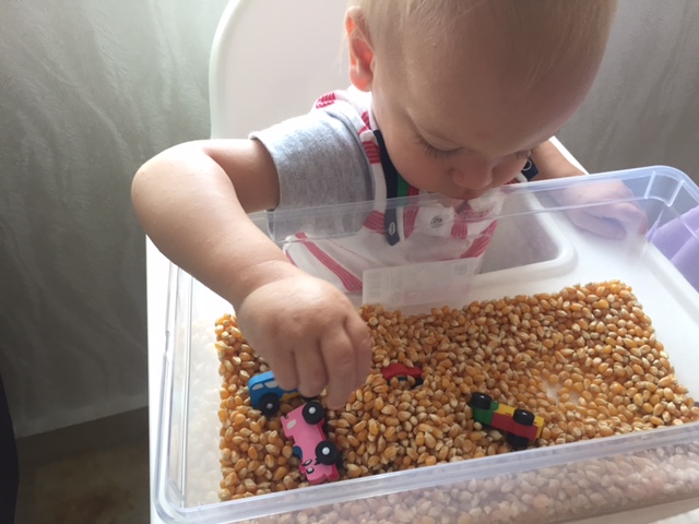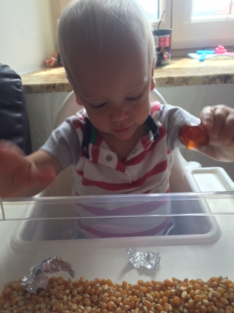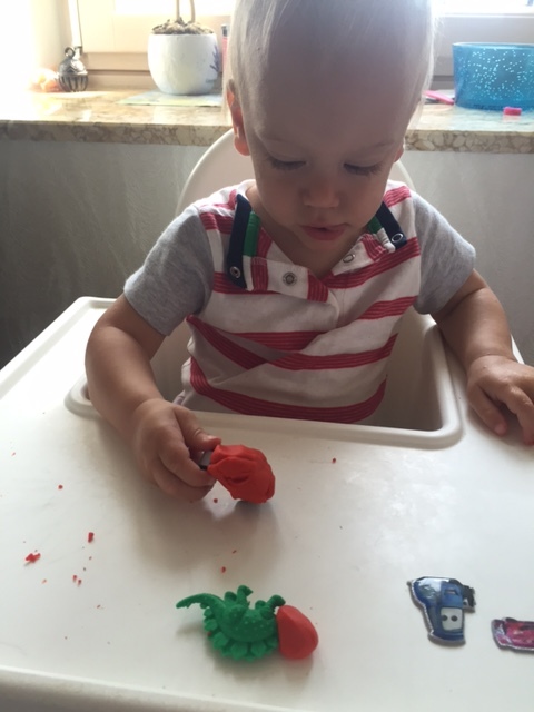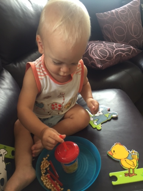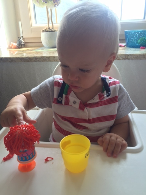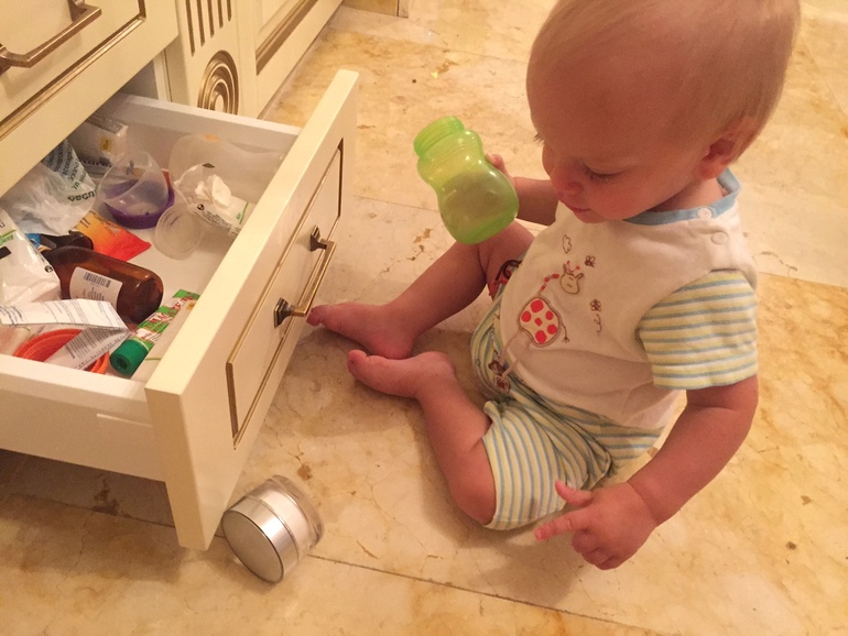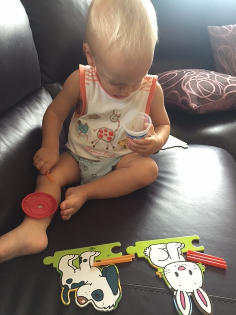 Бывший аптечный ящик перевоплотился в пособие по баночкам и крышечкам. Не все пока получается, но интерес значительный, особенно если менять содержимое. Тоже выручает в критической ситуации, возится в нем минут по десять. Дочка везёт мне целую крышечно-баночную коллекцию ещё из своего детства.