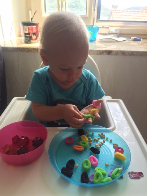 После завтрака традиционно играем в игры Аля-Монтессори. Вот несколько из тех, что удалось заснять. все сделано на скорую руку, с подготовкой особо не заморачиваюсь. Очень нравятся игры с резиночками. Цепляем на ручки, ножки, игрушки, делаем бусы, вкладываем зернышки и фасоль, сортируем, нанизываем на штырь от пирамидки - игр миллион.