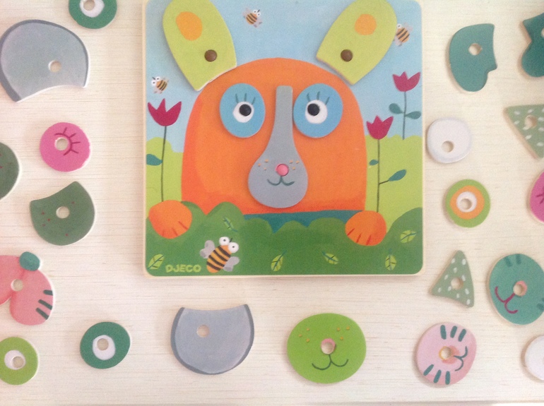 К этим чудесным пазлам интерес просыпается медленно, но верно. Очень нравится рассматривать и обсуждать коробочку, даю по две половинке, "ремонтируем" молоточком, но дальше того, чтобы положить их рядышком, дело пока не идет.