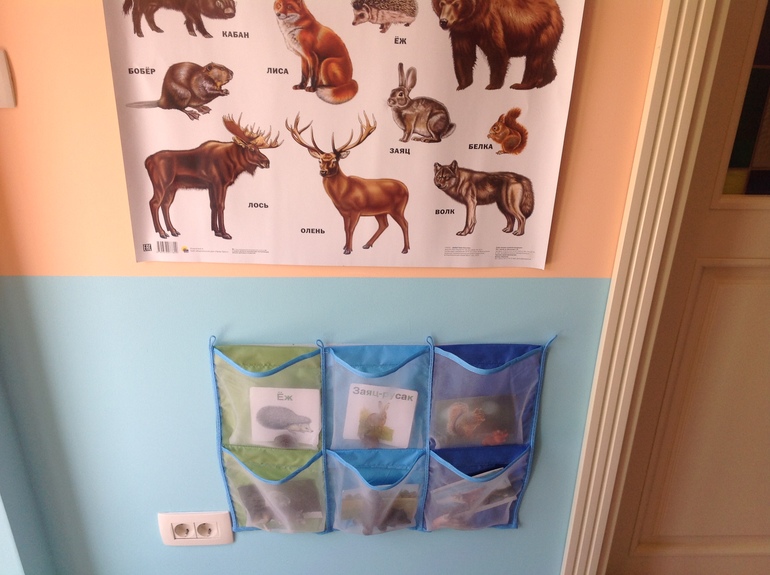 Эти карманы последнее время заполняю таким содержимым. Периодически вытаскивает фигурки и картинки, процесс нравится. Цель - сопоставить картинку и животное с плакатом, и, естественно, обсудить и поиграть.