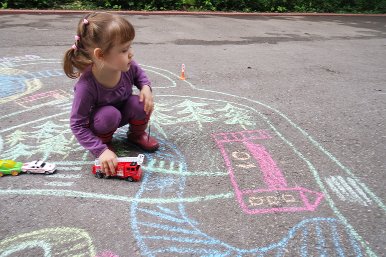 Расставили дорожные знаки, нарисовали зебру и стали играть. ...тоже несколько дней)