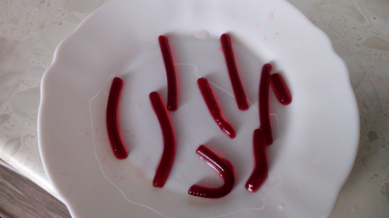 -сделала съедобных червяков (желе из трубочек). Димон выловить и съесть их не смог))) Обычное желе слопал за обе щеки)))