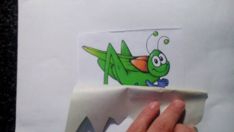 -сделала поделку "ползающий жук". Смысл такой, снизу, под рисунком приклеила две коктейльные трубочки, через них протянула веревки, на верхнем конце веревки завязаны в один узел, на нижнем - концы веревок свободные. Растягивая веревки, заставляем двигаться рисунок.