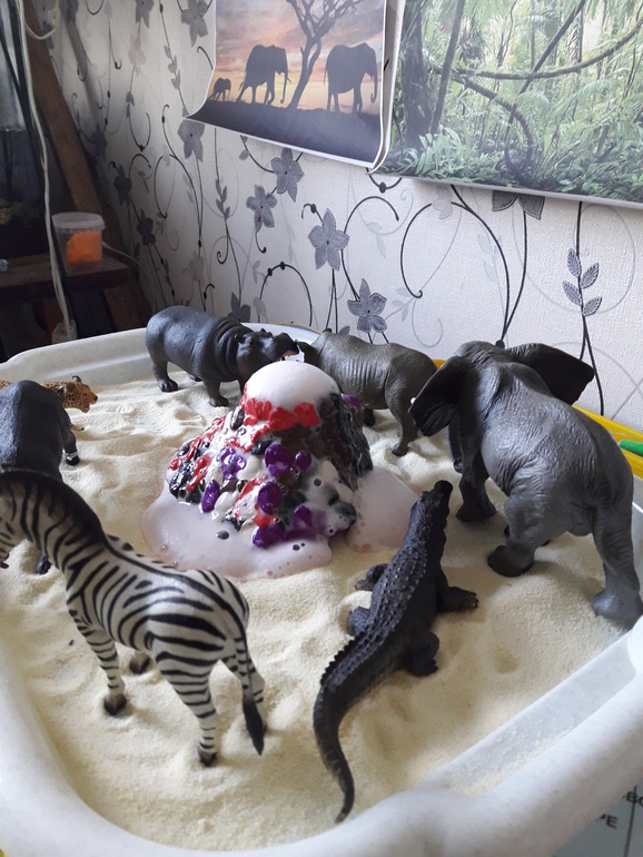 И проводили опыт, извержение вулкана. Вулкан лепили вместе, а Аня рассказала мне что если в лаву, попадет холодная вода, то она превращается в камень