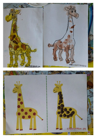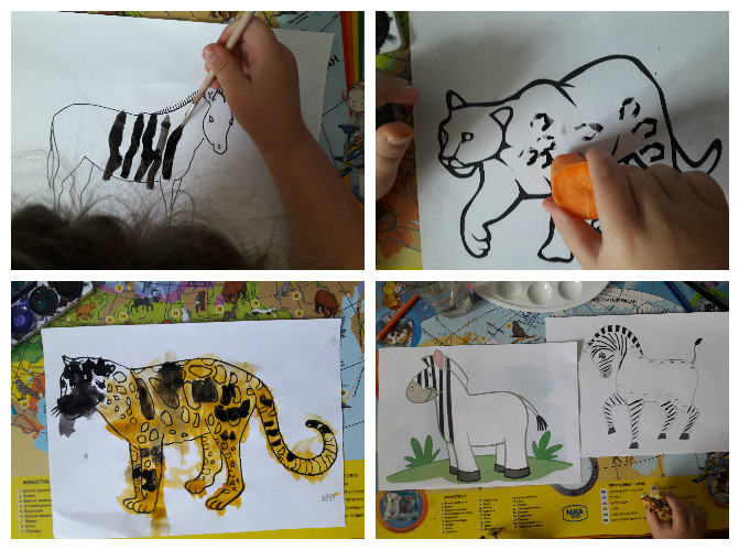 Дорисовывали полоски зебре и пятна леопарду, пятна делали штампами из морковки: