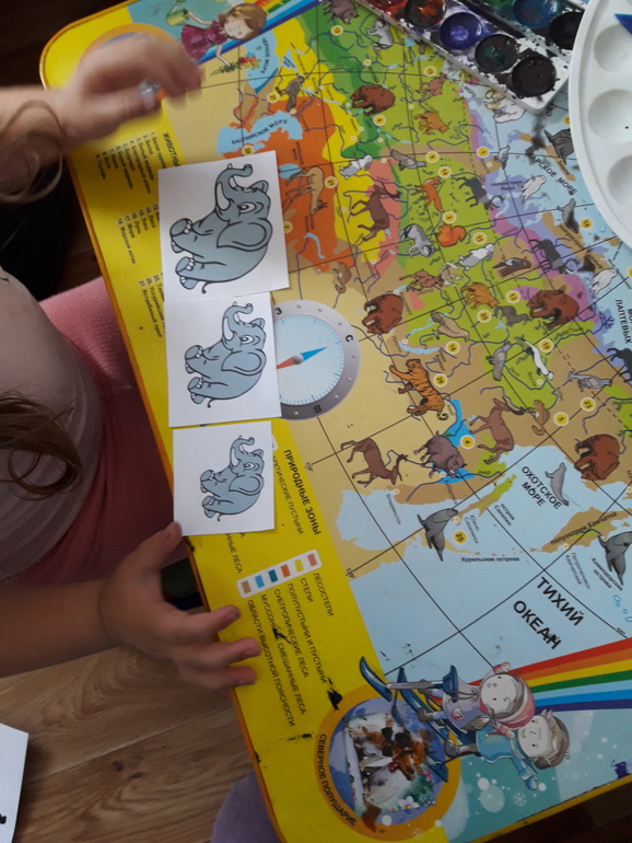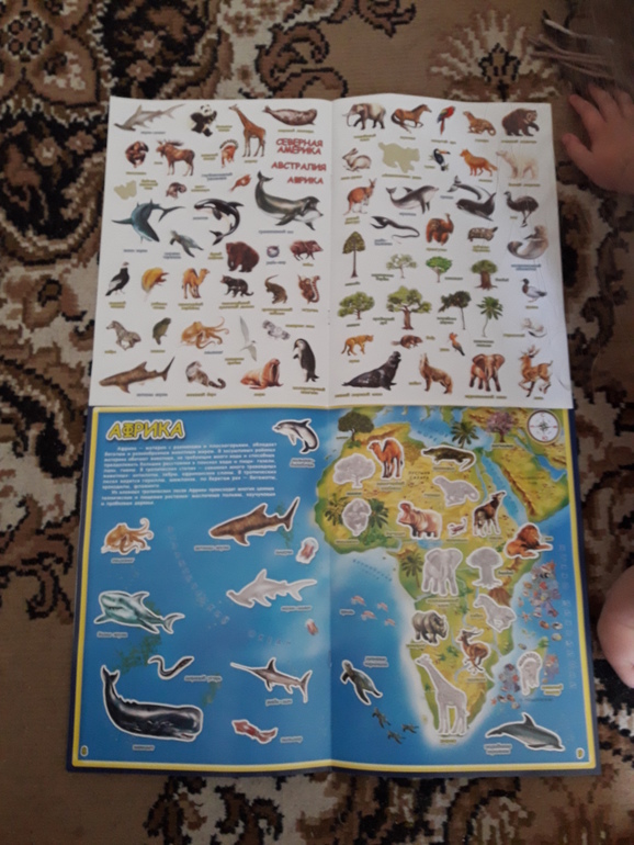Ребенок в восторге, каждый день день говорит, Мама, ну давай уже изучать Африку! Про каждого животного знаем основные факты, например: Жираф - самый высокий, длинная шея, ест листья, бегемот - живет в воде, очень большой, большие зубы, ест траву. Легко распознаем части Африки.