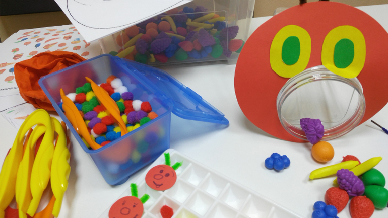 9. Украшаем семейство гусеничек - делаем их красивыми и яркими. Наваяла пособие за 10 минут - в основе лоток для замораживания льда на 96 ячеек. Хотела его разрезать на полоски, но дома это показалось нереальным, поэтому просто в шахматном порядке приклеила головы гусеничек с усиками, и муж нарисовал мордочки)) Раскладывали помпоны пинцетами во все ячейки. Дети мое творчество оценили положительно)) Заодно умение выполнять задание всем вместе потеринровалось.