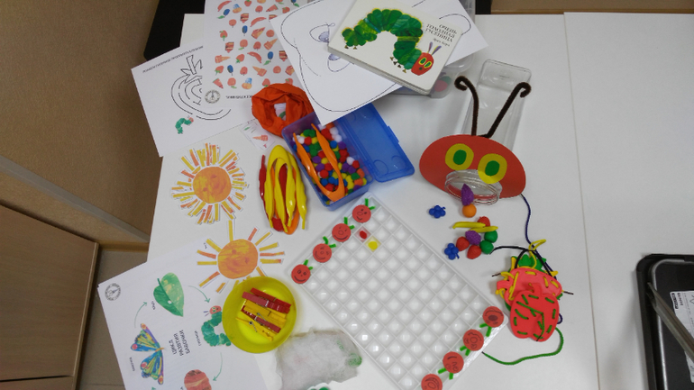 4. Эксперимент - наглядно показываю цикл на примере "яйца" из киндер-сюрприза, открываю, там гусеничка (сшила 4 помпона за 3 секунды), потом вместе заматываем гусеницу в бинт, потом вместе разматываем заранее замотанную бабочку (Бабочка из кальки тоже сделана в течение 15 секунд)
