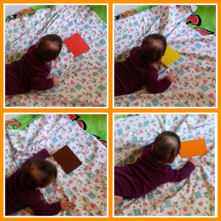 Умные прогулки.В выходные решили немного позаниматься творчеством. Ну какие могут быть занятия без комплекта "Творчество с пеленок" от Умницы. С малышкой мы сейчас проходим седьмую недельку обучения, учим основные цвета. Научились смотреть на карточки под новым углом : ))) Обычно было лежа на спине. Сейчас даже пытаемся схватить руками, пока не получается.