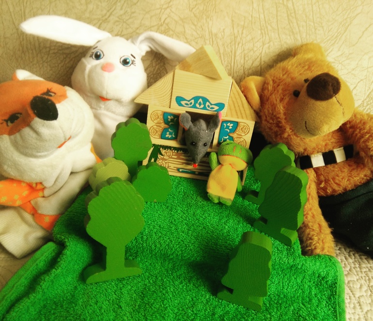 2. Теремок я построила заранее. Затем показала Мише спектакль. В момент появления медведя подключился и мой Миша и с большим удовольствием разрушил теремок. Затем все вместе отстроили новый теремок.