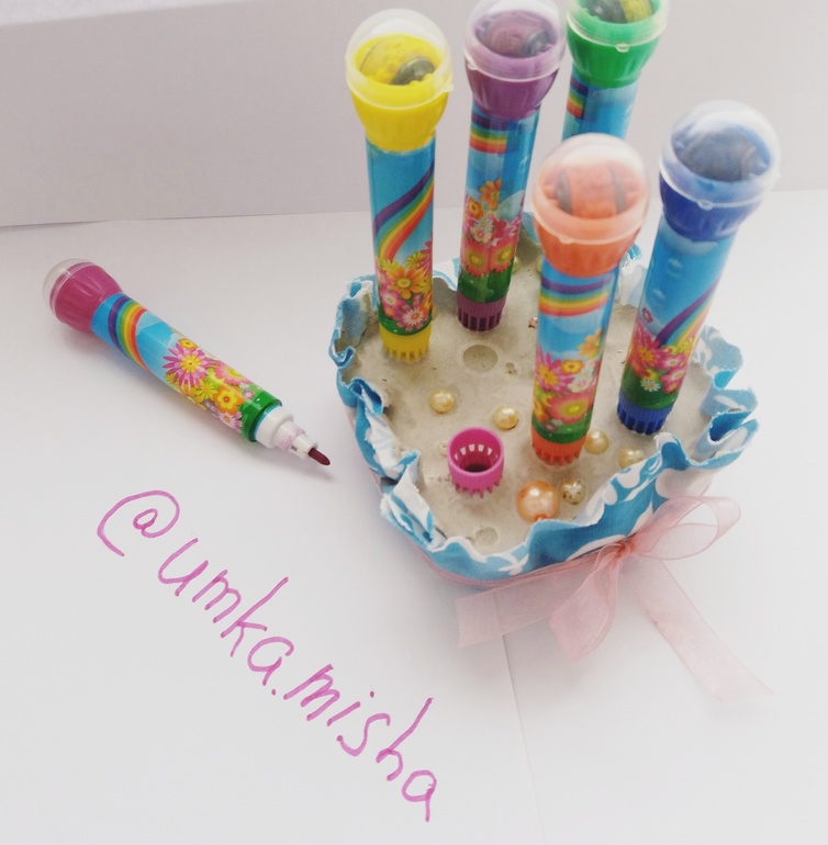И еще одна супер удобная вещ - самодельная подставка под фломастеры. Благодаря ей колпачки не теряются, фломастеры не пересыхают и всегда находятся на своем месте