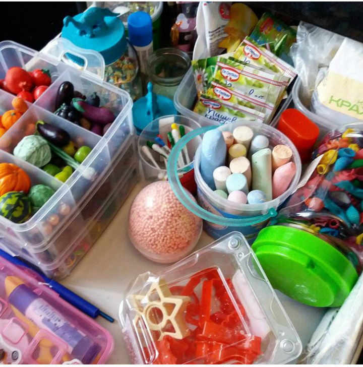 Большую часть материалов яюдля творчества и сенсорных коробочек я храню в ящике на кухне. Ведь именно там я формирую сенсорные коробочки, делаю самодельнве массы для лепки, да и часто занчтия проходят именно на кухне, т.к. там проще убирать последствия наших эксперементов и игр))