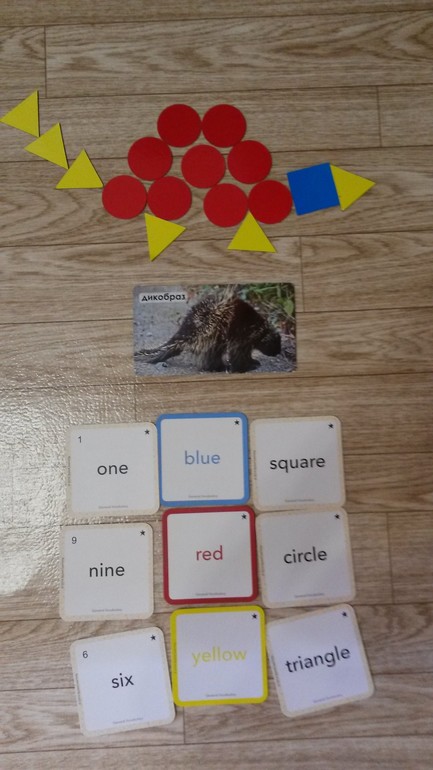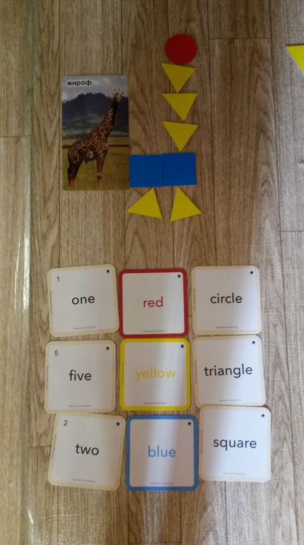 Напрыгавшись, решили немного заняться творчеством. Взяли из «мира на ладошке» любимых животных и выложили из фигур, получилось очень забавно. При помощи карточек Марго самостоятельно описала из каких фигур состоит животное, например,one blue square. Повторили написание цветов, числительных и фигур.