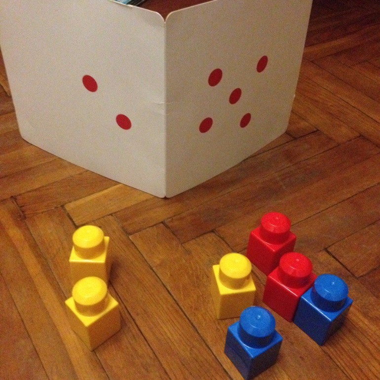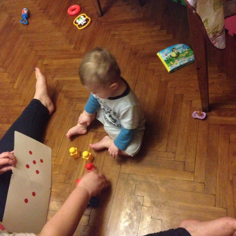 Показываю одну сторону (2), потом другую (5), потом раскрываю и получается (7). Решила и наглядно продемонстрировать на детальках из конструктора, складывали их, как счетные палочки(меня так в детстве учили). И цвета повторили, естественно все в процессе игры. Сыну понравилось, внимательно смотрел и улыбался)