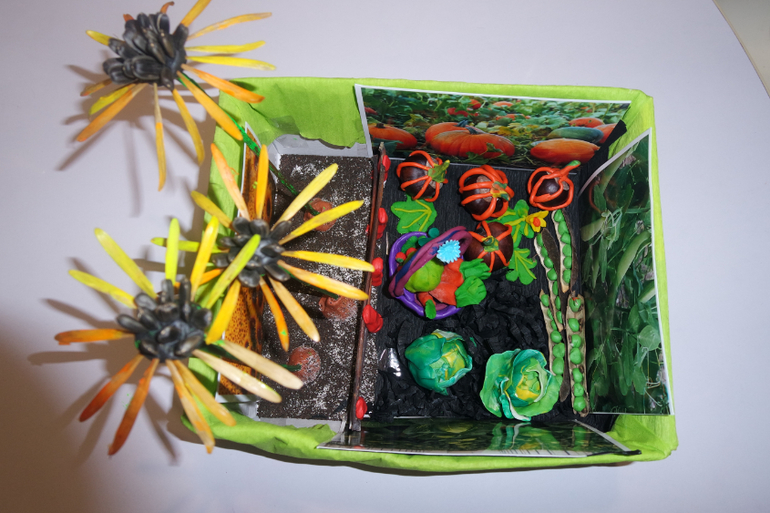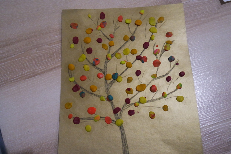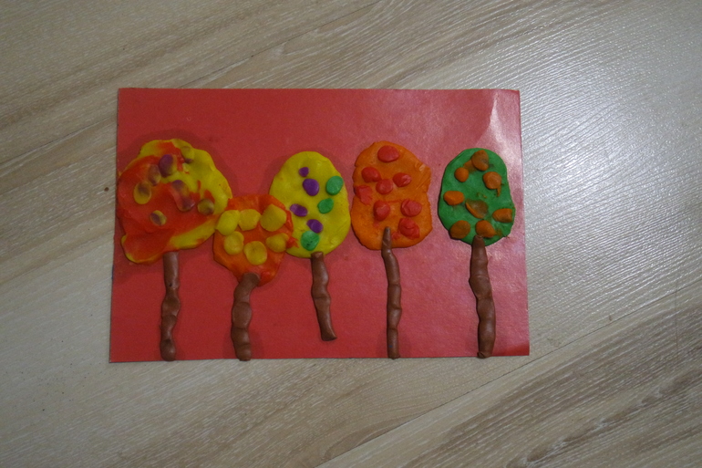 Эта пластилиновая работа выполнялась аналогично : пластилиновые листики размазывали в одном направлении.