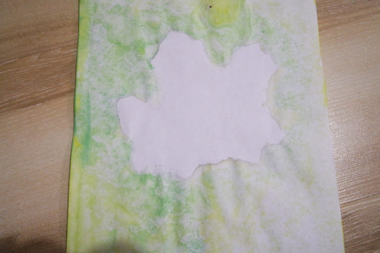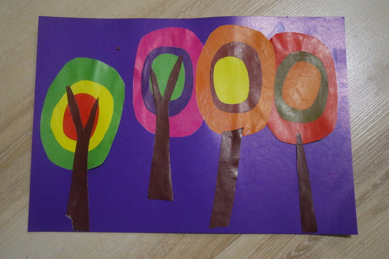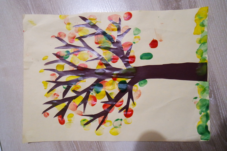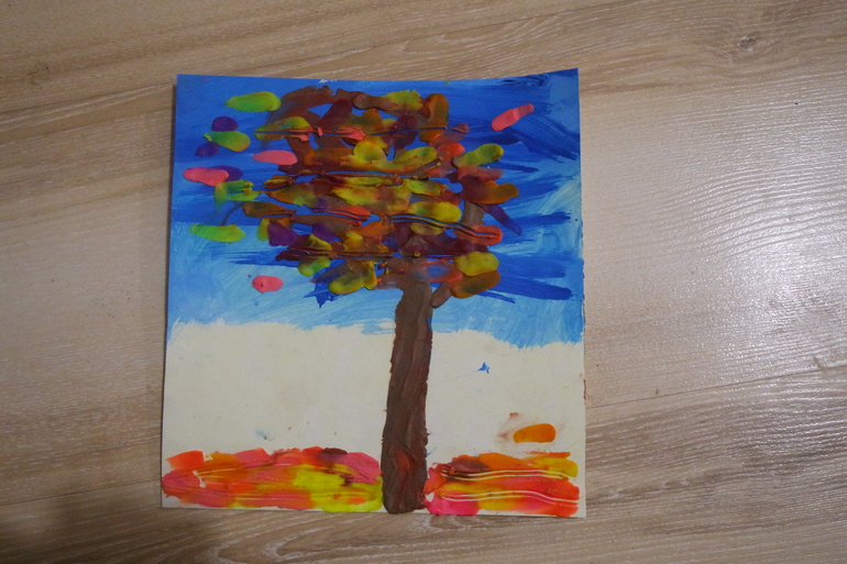А еще отнесла рисунок "Ветер" на подобии вот этой работы. Я дала заготовку ствола. Лиза из пипетки накапала осеннюю листву и с помощью соломки сдувала капли в одну сторону.