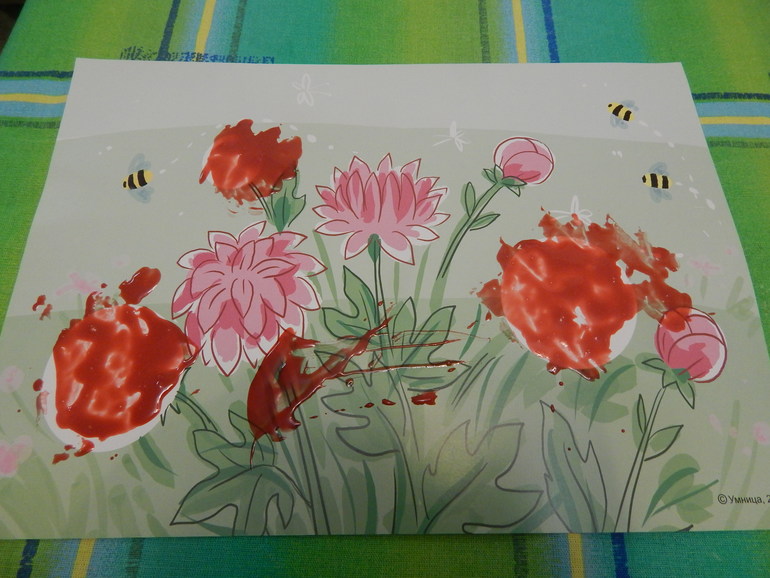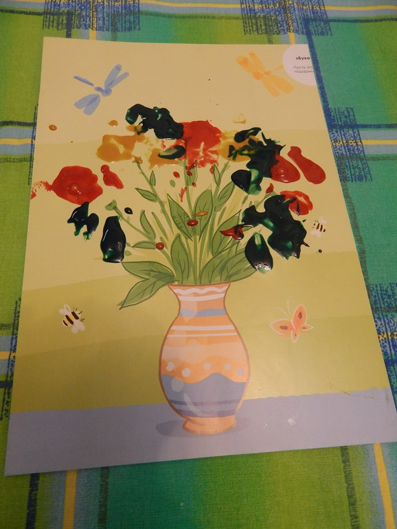 Договорились со Славушкой, что нарисуем букеты цветов. Слава сама выбрала арт-листы с цветами из комплекта . 20 минут усердной работы: