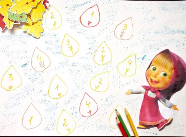 Игра "Помоги МАше"- подул сильный ветер и листочки все опали, весь мишкин двор в листве. Маша решила помочь своему другу. Берем вырезанный листочек, считаем крапинка, обращаем внимание на цвет.затем находим циферку на листе и раскрашиваем в цвет вырезанного листа. Звучит замудренно, но игра игтересная
