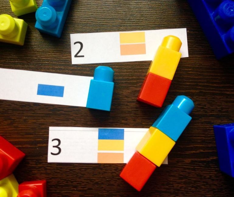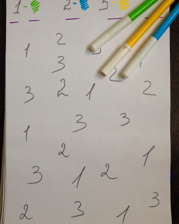 Колпачки по нашему, прячем маленькую игрушку по стаканчиком. Ребенок ищет игрушку, поднимая стаканчик и называя цифру, а затем ставит в нужное место на листе