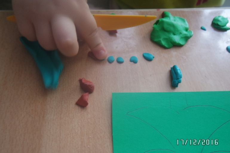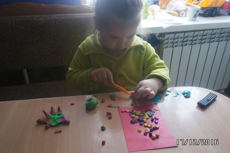 Аня делает пластилиновые колбаски и режит их стеком. Отрезанные кусочки приклеивает дорожкой к столу....и так весь стол....