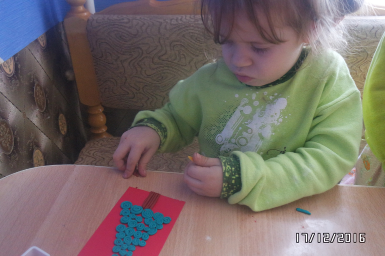Я дала зелёный пластидин и предложила приклеивать кусочки на шаблон ёлочки. Анюта отклеила мой кружек с ёлочки и приклеила на стол....