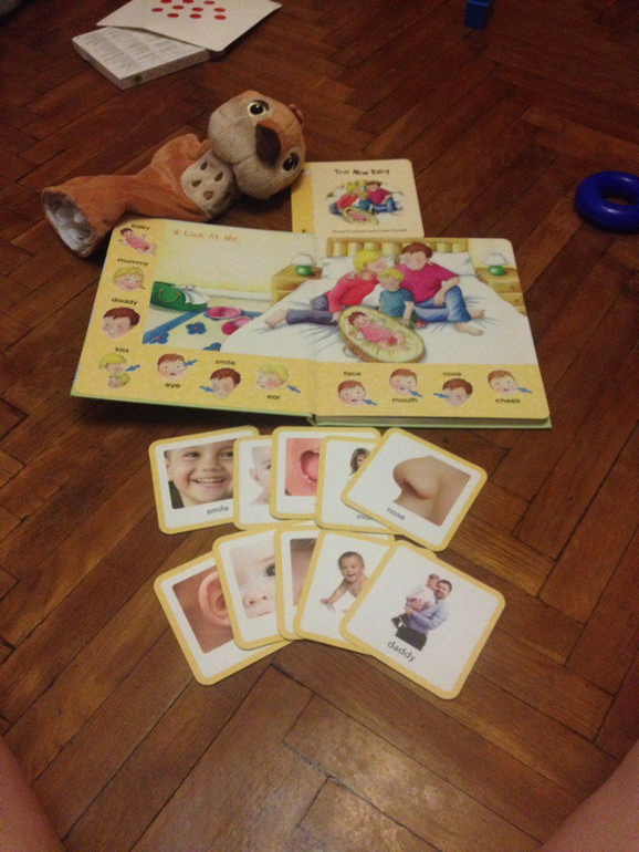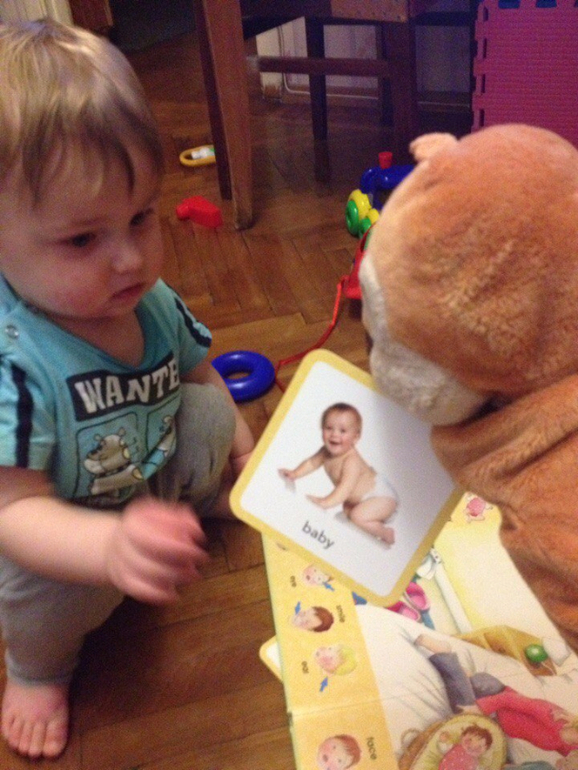 Тематические недели, дни и занятия от 0 до 3Сегодня день английского. К нам снова прилетал skaylark из комплекта Умницы. Почитал книжку "the new baby". Ещё раз показал нам части тела и почитал новую большую книгу-словарик. На картинке нашли те же части тела, что и на карточках. Одна из последних умелок- это переворачивание страниц. Теперь Мирослав листает любую книгу, а мама читает. Ждёт, пока я дочитаю текст, раньше не переворачивает. А наш друг-skaylark стал для нас телефоном. Не знаю с чего вдруг, но сын берет его, прикладывает к уху и говорит АЛЁ-АЛЁ. Я понимаю, что он повторяет за мной, но почему жаворонок в качестве телефона-не понятно. В конце нашей игры послушали английские песенки. Нам подруга дарила игрушку Chico, поёт на русском и на английском языке, говорит отдельные фразы, кстати песенки очень мелодичные и вообще не раздражают ( как многие). Получилось весело, но как-то быстро. Но, даже этих 5-7 минут достаточно, что бы у него что то отложилось в голове.