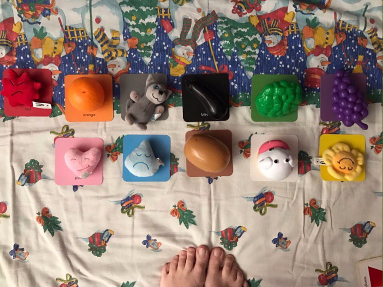 Сегодня был тяжкий день. Эта предновогодняя суета, в магазинах куча народу и в принципе, на улице. Все куда то бегут, подростки на каждом шагу взрывают петарды. Так как это единственный выходной у мужа, пошли и мы закупаться. Зашли в дет мир, за подарками. Большинство игрушек поломано, на полках бардак, как в Ашане в выходные. То, что хотели, не купили, вчера ещё было, а сегодня уже нет, и как на зло, времени не было ехать в другой дет мир, или заказывать в интернет магазине. Отвыкла я от такого количества людей))) Пришли домой) а тут все тихо и спокойно. Придумывать новые игры с Мирославом не было времени. Так что мы просто почитали книжку из набора Skylark "seven little toys". Посмотрели карточки с изображением игрушек, нашли такие же игрушки у нас в коробке. Повторили цвета на английском, отыскали игрушки такого же цвета. И что-то новенькое для нас... Фигуры, пока только познакомились с ними и потрогали объёмные их копии) (то что нашла мама) Вся игра проходила с нашим постоянным другом) Skylarkом, которого мы начали обнимать. Сам, стащил его с моей руки и крепко обнял. Может попробовать засыпать с ним)