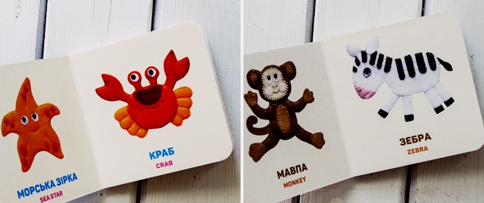 На каждой страничке книги написано название того или иного животного и его перевод на английский язык. Надписи проиллюстрированы фотографиями ярких забавных игрушек-зверушек из фетра, которые были сделаны непосредственно автором серии и просто креативнейшей мамой - Еленой Забара.