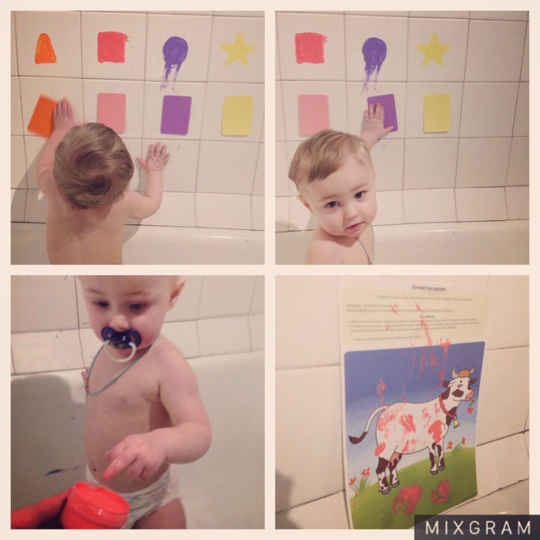 ) Нашли соску и начали рисовать) Детишки-повторюшки) я тоже макала палец в краску, рисовала в ванной, а сын продолжал мои творения, пока ему сложно рисовать без подсказок. Позже прилепила арт-лист с коровой, ей надо было дорисовать пятнышки пальчиками. В прошлый раз, мы тоже рисовали пятнышки. У меня 2 одинаковых листа. В Творчестве с пелёнок задумано, что бы на одном листе рисовала мама, показывала как надо, а на другом трудился малыш, но у нас это ещё впереди) поэтому оба листа для Мирослава. Пятнышки в этот раз получились ровнее) А потом Мирослав нашёл свои игрушки для купания) и макал резинового львёнка в краску. Мне идея понравилась и мы продолжили тоже самое с другими игрушками, с одним правилом, цвет игрушки, которую макаем, совпадает с цветом краски. Игры с красками затянулись минут на 25. Уже и папа пришёл с работы, Мирослав всегда его встречает) услышал ключи в замке и начал выбираться из ванной, еле удержала его, надо же было сначала отмыться) Дальше происходила такая молота) Папа зашёл в ванну, а Мирослав начал пальчиком показывать свои творения. На корову "муууу", на карточки "ка". Водил пальчиком по своим рисункам и что-то эмоционально рассказывал) Хвастался) Конечно, папа не оставил это без внимания и похвалил) Надо обязательно, не забывать поощрять, такие начинания, что бы в дальнейшем было желание что-то творить) В этот раз, ванна и Мирослав легко отмылись)