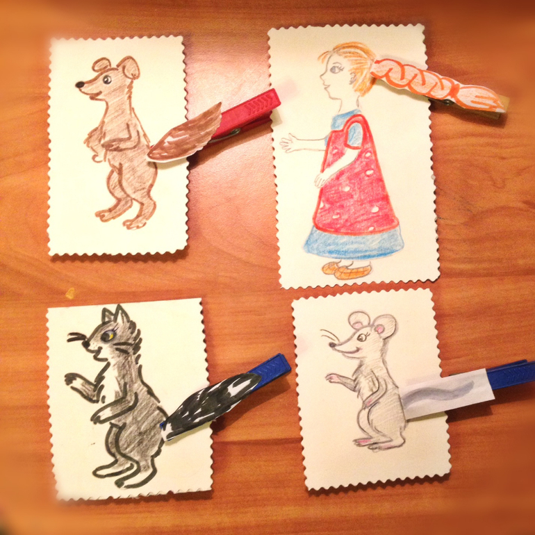 Подбираем зверям хвостики и внучке косичку. Хвосты на прищепках.