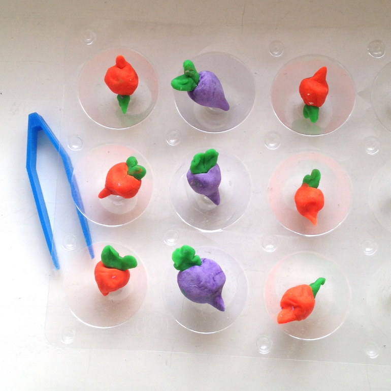 Тренируем пальчики - сажаем маленькие репки. Тут тоже присутствуют свеколки. Лепила овощи из плейдо, потом засушила.