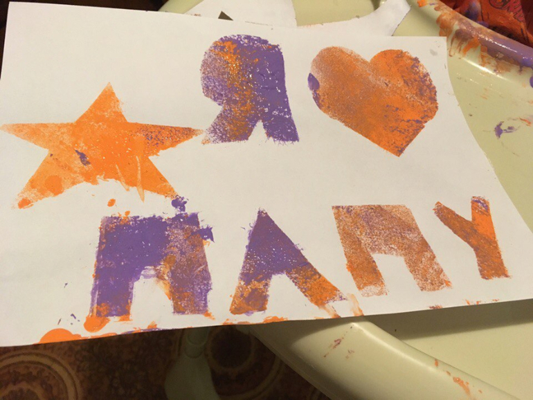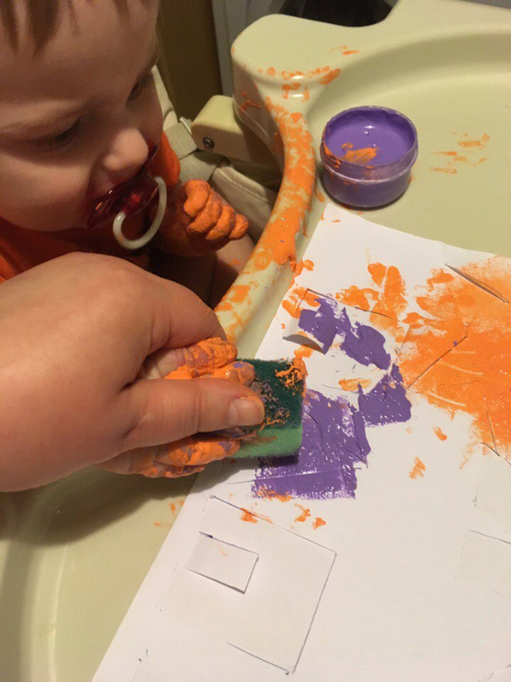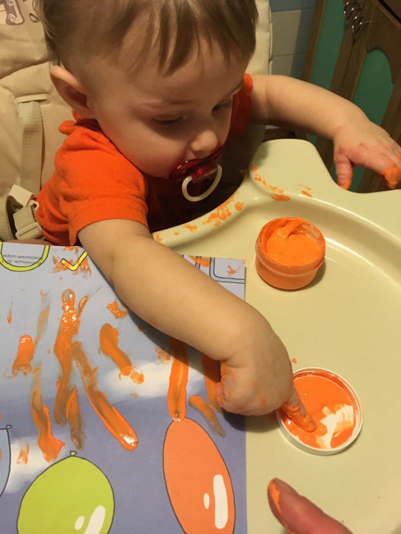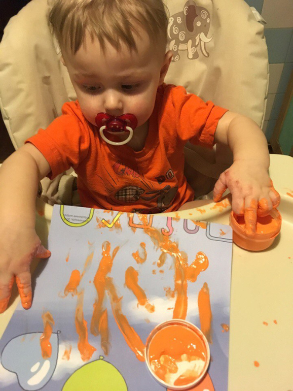 Творческое развитиеМы тоже решили сделать поделку и подарить папе на 23 февраля) Ну и что, что нам годик, не оставлять же папу без подарка) мама поможет. Сначала , надо разгореться. Достали листы для рисования из Творчества с пелёнок. Задание было, нарисовать фломастером веревочки в каждому шарику. Но с фломастерами мы пока не дружим. Зато, у нас есть пальчиковые краски "каляка-маляка". Мы просто рисовали прямые линии пальчиком, есть такая техника и она полезна для моторики. В методичке вычитала, что есть способ рисования губкой, и тут пришла идея сделать крутую поделку. Я ее готовила пол часа. Нарисовала на бумаге, то что будет рисовать Мирослав, потом вырезала это канцелярским ножом, получился трафарет. Наложила его на чистый лист, по бокам скрепила маленькими кусочками малярного скотча. Полотно для создания шедевра готово) Лучше это делать из картона, но его под рукой не оказалось. Разрезала губку на несколько частей, брала руку Мирослава, вкладывала в неё губку, макали губку в краску, и тыкали по всему полотну. В конце просто отклеила трафарет и получилась такая красота) Для первого раза, очень даже ничего) и только я хотела все убрать, сын продолжил "рисовать" ,на столе это гораздо интереснее делать. Хорошо, что все легко отмывается, кроме сына