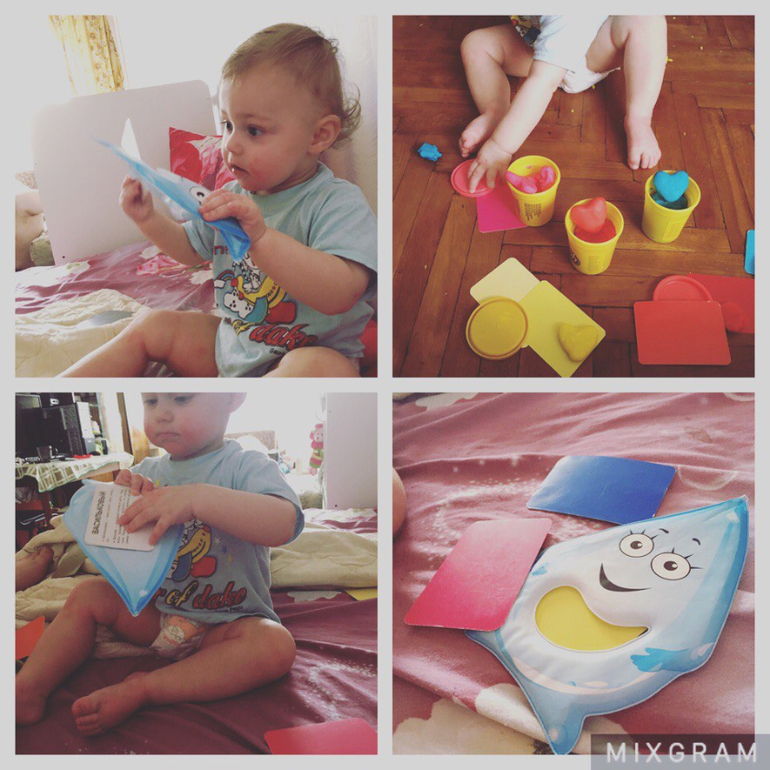 Мне все лень, я какая-то вареная. И Мирослав проснулся, покушал и начал капризить. Лезет 8 зуб, дерматит обострился, чешется и ноет мой карапуз. Просит внимания и развлечений. А я никак собраться не могу. Почитали книжки, но они быстро надоели. Достала наши цветные карточки из "Творчества с пелёнок" и играли в игру "капелька прыгнула на цвет" и на ней он залип. Суть в том, что я вставляю карточку в игрушку-капельку, озвучиваю цвет, а Мирослав пытается ее достать, и так по кругу Капелька прыгает на цвет) Капельку, сын называет "Кап-кап" и пытается засунуть карточку обратно) А ещё пластилин) Мирослав его очень любит. Достала баночки playdo, карточки взяли с собой и переместились на пол. Незаметно, мы все оказались включены в процесс) Я лепила сердечки, которые мы раскладывали по баночкам. Муж катал колбаску. А сын отщипывал кусочки и разбрасывал по полу. Потом помогал папе катать колбаску. А вообще, последнее время, он все повторят за папой, просьбы папы выполняет чаще, чем мои, недавно собрали вместе башню из конструктора, а со мной он только раскидывает детальки) наверно, это их мужское) Мы целый час тусили на полу с пластилином и карточками, в процессе придумывали новые игры) и вроде я немного пришла в себя)
