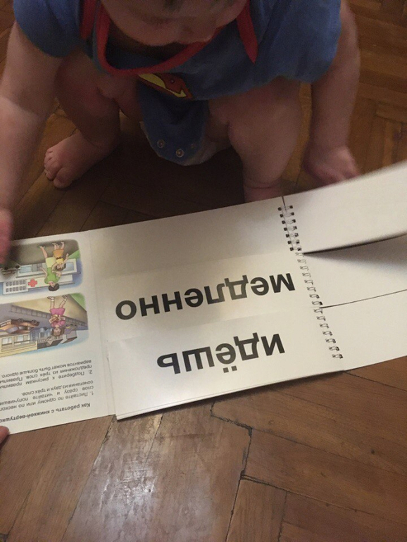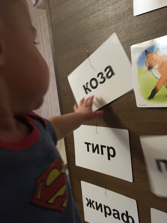 Методическая копилка: Идеи на месяц, Организация пространства, Хранение игр и книг, Книги для родитНедавно одна мама написала мне "за что такие спокойные дети?" Имея ввиду, что Мирослав сидит и спокойно смотрит карточки) Да, Мирослав очень любит карточки и книжки, но это не означает, что он постоянно только и делает, что читает) Он мальчишка, причём достаточно шкодливый и любопытный, как и все дети) Иногда, я голову ломаю, что бы такого придумать, что бы сыну интересно было. Сегодня я решила повесить карточки. Никогда не пользовалась этой формой показа, мне было проще показать из рук. А что бы было интереснее, я приклеила их на нитку, что бы легко можно было показать слово и изображение на обратной стороне. В нашем случае-это животные, которые не надоедают ему никогда) я показала, как интересно их переворачивать, но сыну было интереснее их отрывать) И пусть. Он увлечён, ему нравится это делать, в конце концов, это тоже моторика и секунд 5 он смотрел на карточку. Этого достаточно. Моя подруга по "Умнице" написала правильные слова. "Для одной мамы занятие в 10-30 секунд или даже 2-5 минут называется:«совсем не смотрит»,«не сидит на месте».Для другой-«умничка, как хорошо позанимался, попозже продолжим»". Я с ней согласна, даже если ребёнок смотрит 5 секунд, это здорово, завтра он будет смотреть 8 секунд. Начинать надо с малого. У нас такое с новыми книжками. Бесконечно читать, сын может только то, что уже давно знает. Год читаем "репку", и хоть бы раз он закрыл книжку. Я писала, что новые книжки мы вводим по одной страничке, и только через неделю, две, она становится нашей любимой книгой. Правда не все, "теремок" понравился через 3 дня. Мирослав любит переворачивать страницы, по-этому, чем больше страниц, и меньше текста на них, тем быстрее она становится любимой. У нас есть "книжки-вертушки", на которых одно слово на странице. Из них составляется несколько предложений. И сын залип на 5 минут, рекорд для первого раза. Так, что если ваш малыш обратил 2 секунды своего внимания на ваши познавательные игры, не стоит огорчаться, дальше будет больше) не опускайте руки, наблюдайте за малышом, находите те формы игр, которые будут интересны ему.