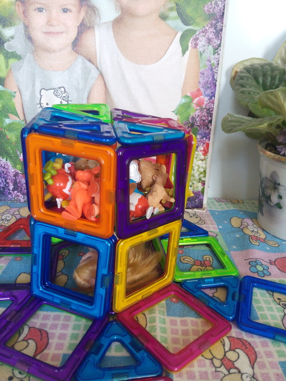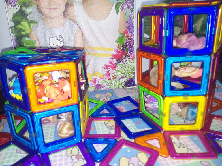 Мы купили магнитный конструктор Магникон. Сразу скажу, это аналог, не оригинал, но и не так уж дорого. Качество хорошее, я ожидала, что это как - то отразится на качестве, но нет. Крепкие детали, пластины вставлены внутри, сколько не наступали на эти части - они целые.