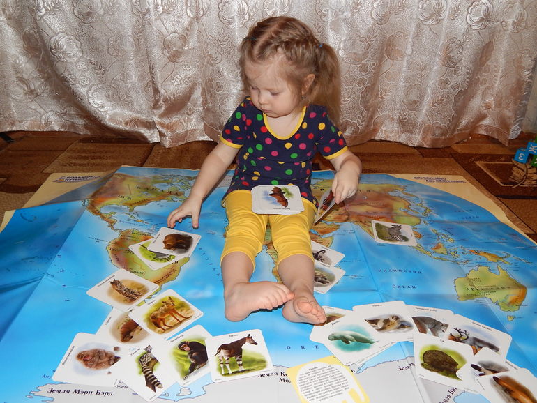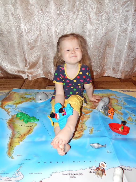 Огорчает очень, что младшую группу не выводят на прогулку(( Теперь выходим из дома на 30 минут раньше, гуляем немного (да и риск встретить кричащего мальчонку тоже меньше), спокойно раздеваемся, заходим в группу в чудесном настроении… Забираю ее тоже часа в 4, стараемся поймать последние лучики солнца, час-полтора гуляем… Пока придем домой, пока ужин, времени на игры и занятия дома в обрез! Вчера, например, успели только собрать 2 пазла, потанцевать и немного поиграть с географией. Расстелила Славушке карту из комплекта «Большое путешествие от Канады до Австралии», определили, где вода, а где суша. Наши любимые герои из Лего летали на самолете с одного материка на другой (больше всего Славке нравится Африка, видимо Айболит и его путешествие на этот материк запали в душу ребенку )))), плавали на лодке между континентами… Раскладывали лего-животных по материкам… Потом достали карточки с животными из набора, тоже попытались их по месту обитания разложить. Еще Слава сказала, что она рыба кит и плавала по морям и океанам))