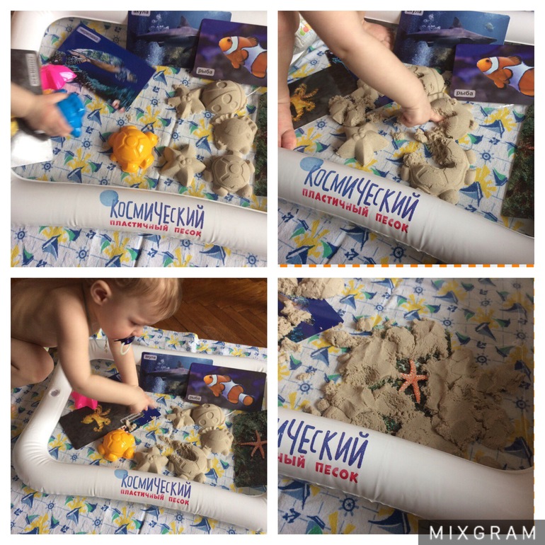 Сенсорное развитие и нейропсихологияС этой сумасшедшей температурой, забыла рассказать о наших новых играх. Сыну подарили кинетический песок) я так рада, он такой крутой. Мне самой было интересного его трогать, лепить из него. А как известно, если что-то нравится родителям, то и ребёнку это точно понравится) Вот и провозились мы с ним целый час. В набор входили формочки, в основном - это морские обитатели, ну и сам Бог велел повторить морской Мир. Достала карточки из Мира на ладошке, слепила черепаху, рыбку, звёздочку, усадила Мирослава) Он с таким интересом давил эти куличики, размазывал пальчиком, а я в это время рассказывала интересные факты о животных. Например: черепаха - долгожитель, они живут более 100 лет. А осьминог умеет менять свою окраску, что бы маркироваться под морское дно. Мирослав складывал песочек в формочки, а потом выкидывал далеко, далеко. Мы устроили настоящий пляж, искали в песке морских обитателей, раскапывали их. Как сказал, великий педагог Ушинский - "Лучшая игрушка для детей - это куча песка". Ничто так не развивает моторику, и не учит творить. Песок очень классный, но всё же - это песок, хорошо что есть пылесос)
