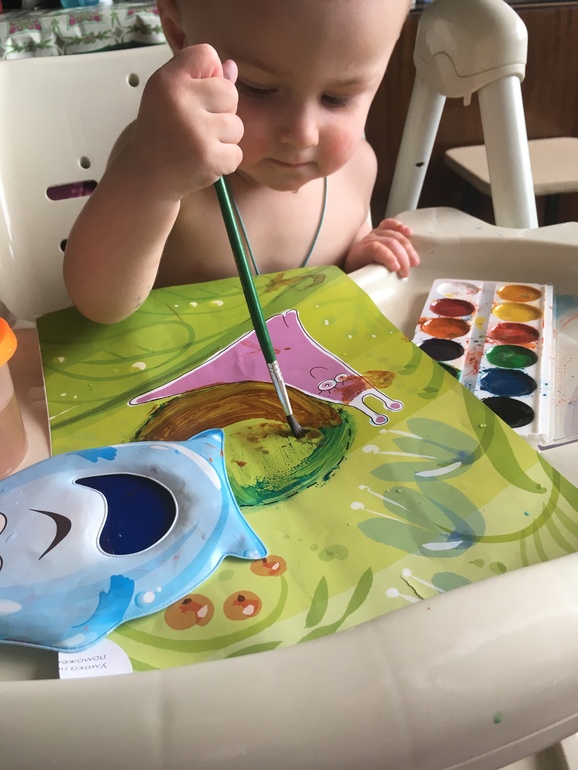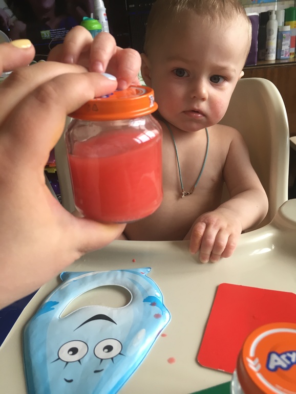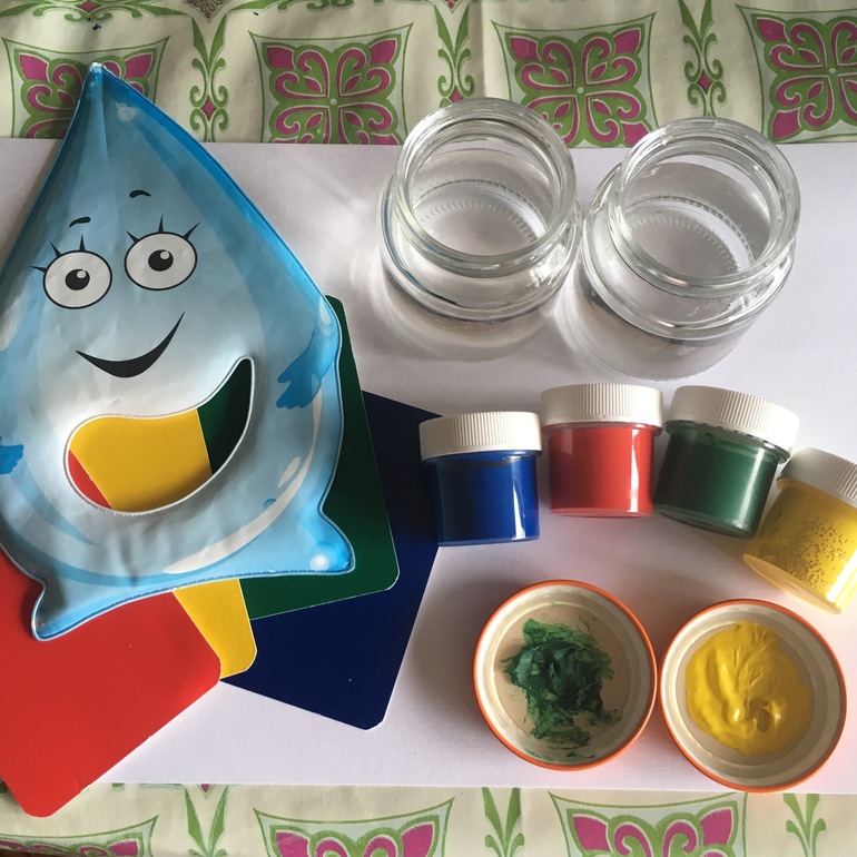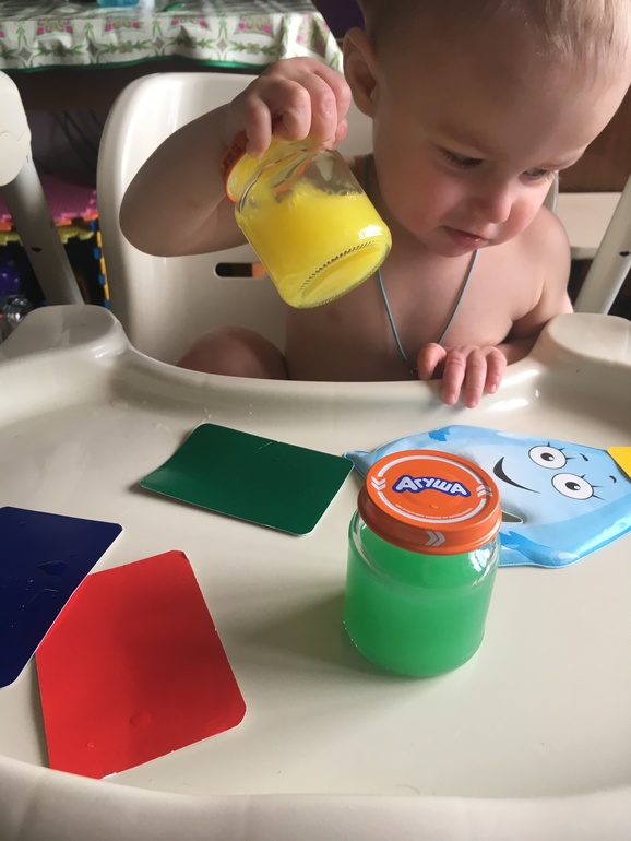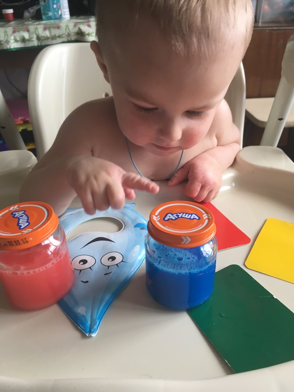 Творческое развитиеДавно видела эксперимент для малышей. Как прозрачная вода становится цветной. Решила повторить. Взяла баночки из под пюрешек, налила в них водичку, а на внутреннюю часть крышки нанесла гуашь. Закрутила. Показываю Мирославу "Видишь, вода в баночке прозрачная, а теперь мы её потрясём и она станет зеленой". Эксперимент элементарный, но такого интереса, у сына я не видела давно. Он сам тряс эти баночки, начали с зеленого и жёлтого цвета. Спросили у Капельки, какого цвета баночки. Мирослав правильно расставил их на карточки. Потом, он решил, что из баночек выходят неплохие кубики и начал строить из них башенку. Я предложила сыну пойти в ванну и открыть баночки. Мы смотрели, как разноцветная водичка стекает по стенкам в слив. Мирослав требовал ещё. Без проблем, все быстро отмыла, подготовила. И вот, Мирослав снова трясёт баночки, а вода в них становится красной и синей. Волшебство) Силы остались, Мирослав требует ещё зрелищ. Предложила ему порисовать красками, он утвердительно кивнул и мы разукрашивали домик улитки. В конце, я понесла Мирослава мыться, а заодно и кисточки, баночки, стол. Ему очень понравилось "ловить" разноцветную воду. Я обязательно повторю этот эксперимент, только баночками запасусь, хотя бы штук 6) Какие ещё эксперименты можно провести с такими крохами?