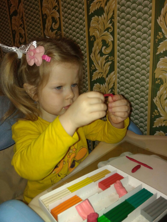 Лепили из пластилина. Дочка своего, я своего. Славка молодец. Скатала шар для головы, сделала колбаски-ножки, скрепила все вместе…