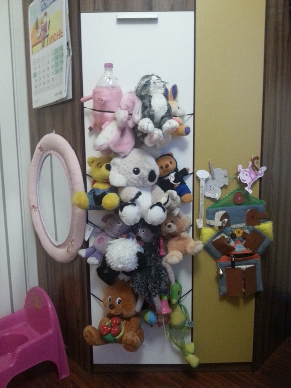 Надо сказать, что мягкие игрушки мы используем часто в ролевых играх. Поэтому они должны быть в доступе. Но где же их хранить, если выкраиваешь каждый миллиметр горизонтальной поверхности.