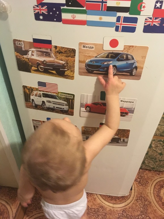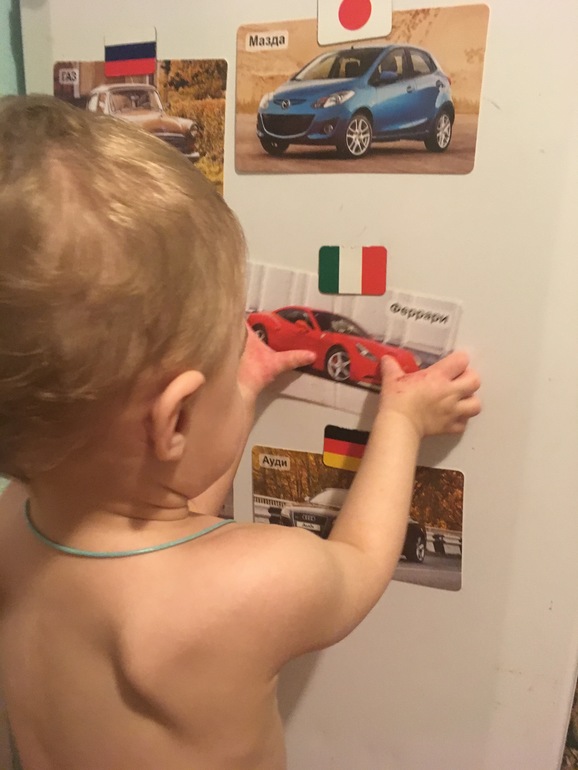 Игры для малышей от 0 до 3 летПогода не радует совсем ( Гуляю с сыном максимум полтора часа, и то, эти прогулки - просто беготня по магазинам. А ещё, мой любопытный и шилопопый Мирослав совсем перестал сидеть в коляске. Приходится кидать коляску где попало и бегать за сыном. Особая страсть-машины. Если рядом припаркованы несколько штук, Мирослав бежит к ним с криком "МА" и изучает. Показывает пальчиком фары, колеса, двери, задние фары, эмблемы, да всё, до чего может дотянуться. Мне бывает очень неловко, разрешения же не спросишь у припаркованной на улице машины. А вдруг, хозяин автомобиля негативно отреагирует на это. И вроде, Мирослав ничего страшного не делает, просто трогает, но кто знает. Увести сына от машин - не вариант. Это можно сделать, но я получу хорошую встряску. Ну а пока, нас никто не спалил) вспоминаем марки машин и цвета. Вечером мы играли с карточками марок машин (мы их смотрим через день) Но сегодня "сортировали" их по странам производителя. Взяла магниты-Флаги из прошлого поста. Прилепила на холодильник. Но магниты, не мощные, больше одной карточки удержать не могли.