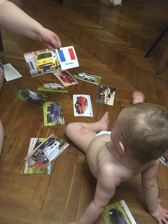 Заканчивали свою игру привычно, на полу) Мирослав давал карточку с машиной, а я подбирала под неё карточку с флагом страны производителя.