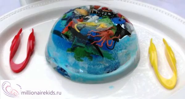 8. Море - в тазу выложить влажные шарики для полива цветов, налить немного воды и заселить морскими животными